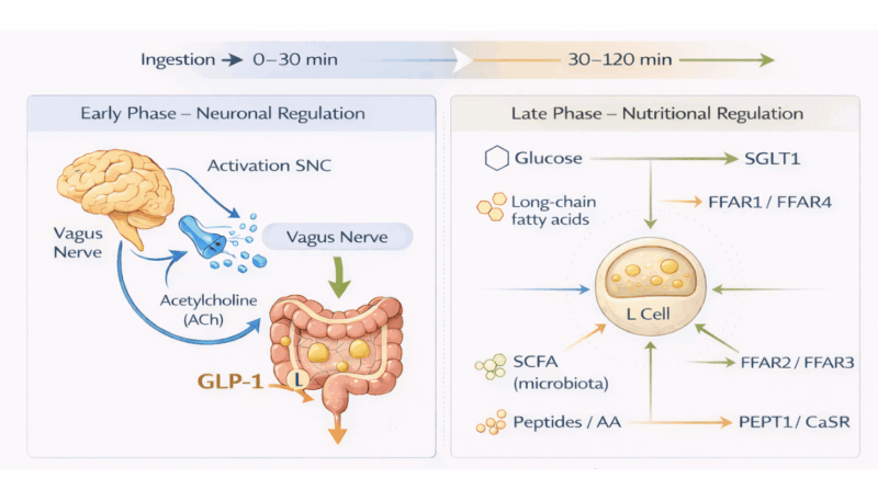 Following food intake, an early phase occurs mediated by vagal activation and neuroendocrine mechanisms, followed by a second phase dependent on the direct contact of nutrients with the intestine (1). In this latter phase, glucose, fatty acids, microbiota-derived SCFAs and peptides or amino acids stimulate intestinal L cells through specific receptors and transporters (1,7).